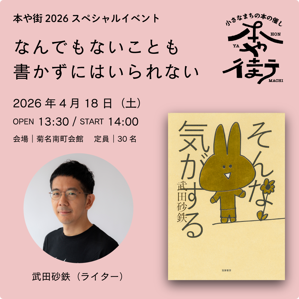 4月18日に開催する「本や街2026」のスペシャルイベントとして、『そんな気がする』(筑摩書房)を刊行したばかりの武田砂鉄さんをお招きしてトークイベントを開催します。題して「なんでもないことも書かずにはいられない」です。
